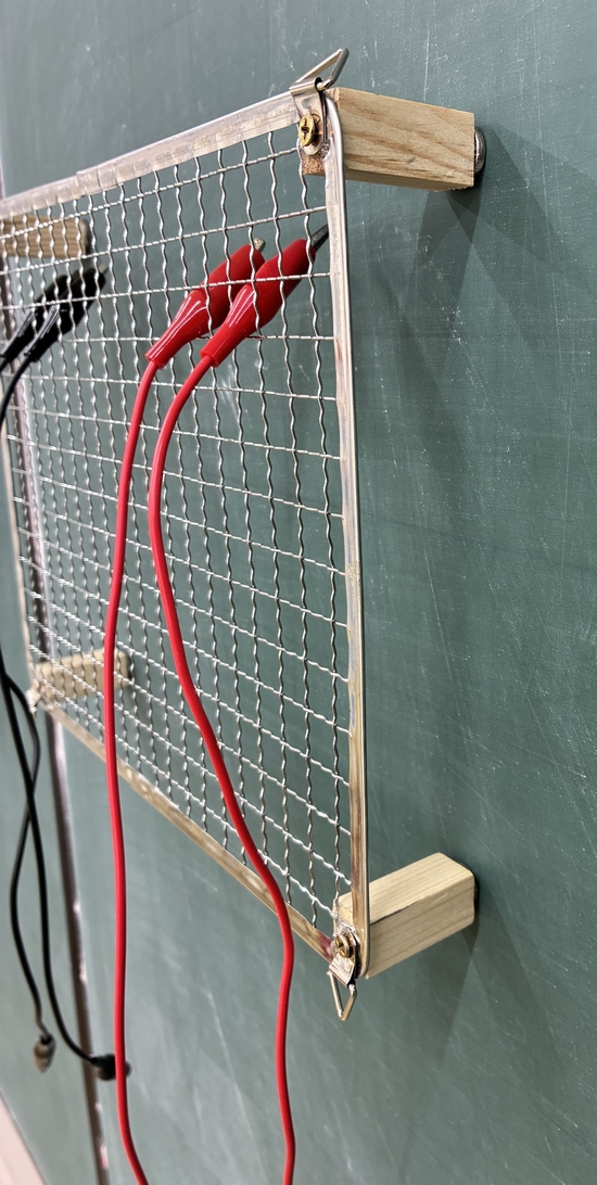 写真では、モチ網に35mmの高さの「足」をつけ、黒板に磁石で貼り付けています。