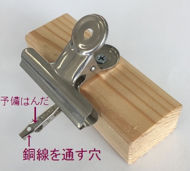 クリップの金属部分に1カ所穴が開いています。そこに銅線を通し、